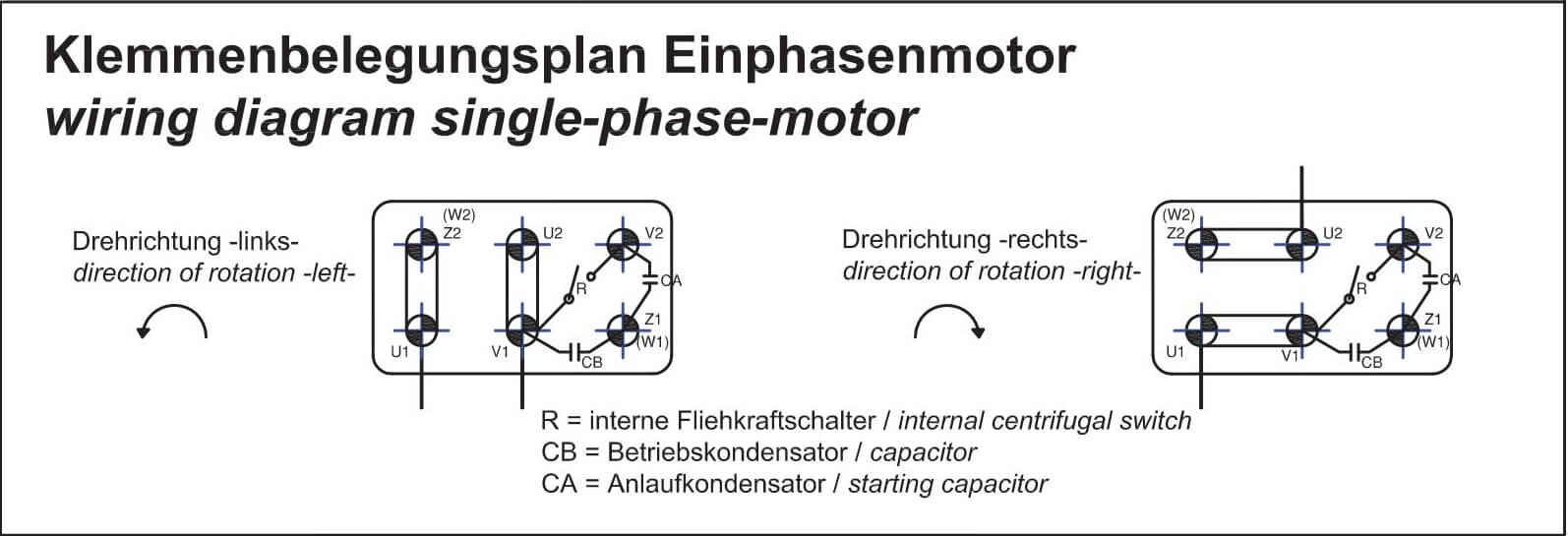 Hier erhalten Sie den allgemein gültigen Anschlussplan für einen Einphasenmotor. Bitte vergleichen Sie diesen mit dem Anschlussplan, der sich im Klemmkastendeckel befindet. Bei Abweichungen setzen Sie sich bitte mit uns in Verbindung.