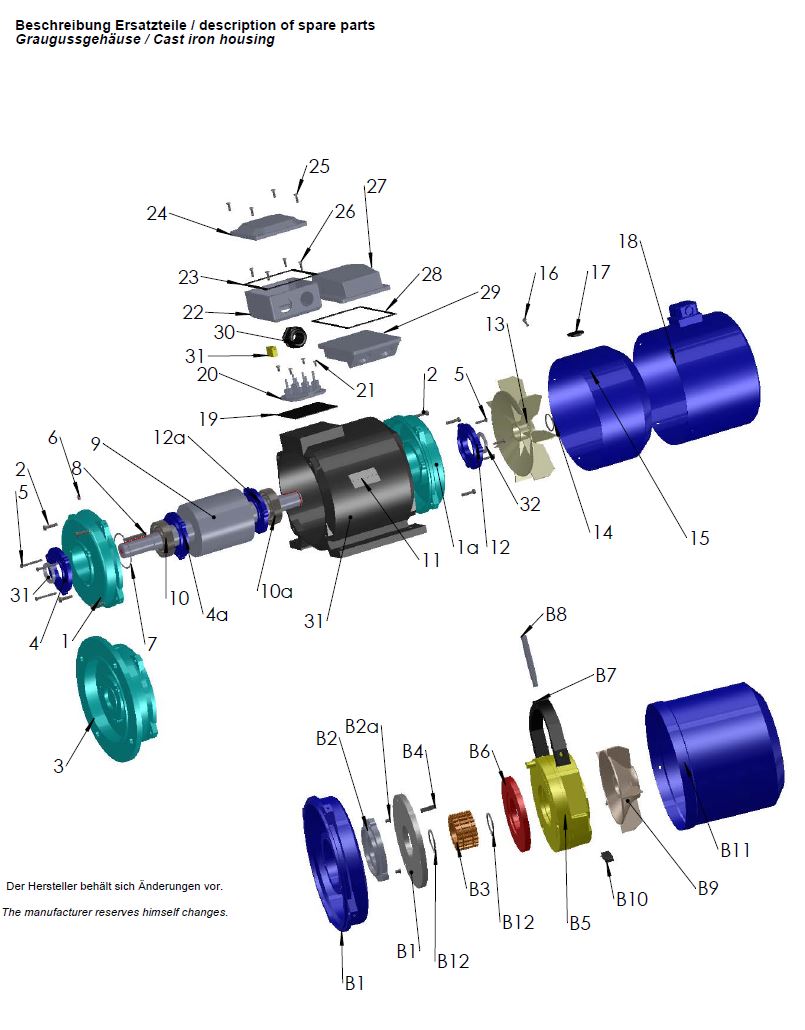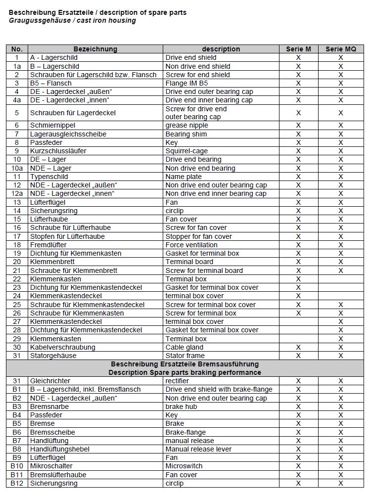 Selbstverständlich sind Ersatzteile für Elektromotoren / Bremsmotoren aus Grauguss erhältlich. Da diese nicht vollständig im Onlineshop aufgeführt sind, sollten diese per E-Mail angefragt werden. Um hier die entsprechende Artikelbezeichnung zu finden, ist die unten dargestellte Explosionszeichnung mit Ersatzteilübersicht sehr hilfreich. Diese Angaben sind auch in der entsprechenden Bedienungsanleitung / Betriebsanleitung zu finden.